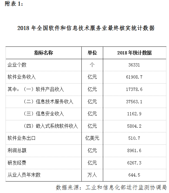 工业和信息化部严格按照国家统计局批准的《软件和信息技术服务业统计报表制度》规定,核实了2018年软件和信息技术服务业统计年报数据,现将最终核实情况通报如下: